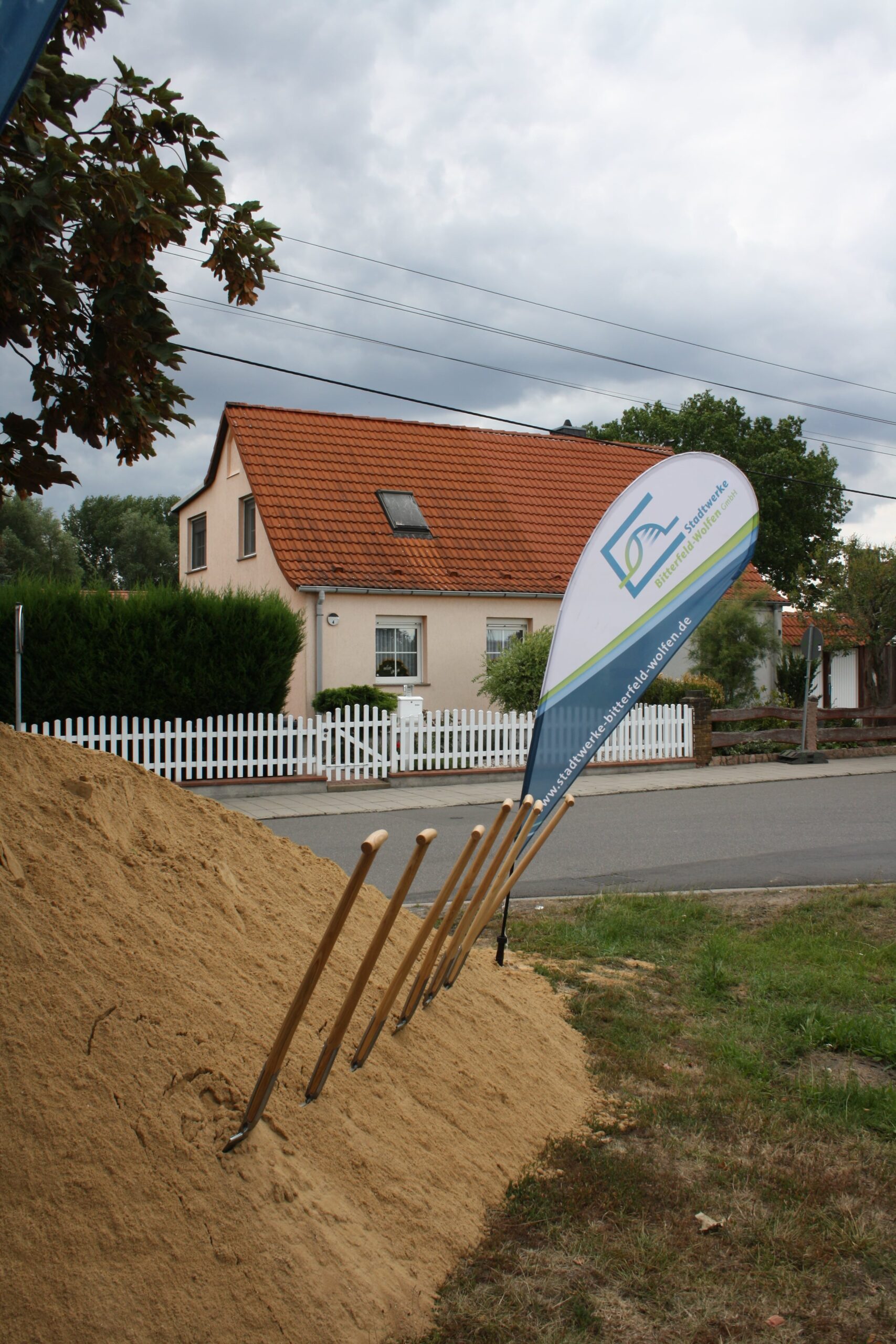 Mit dem ersten Spatenstich am 04. August 2020 gaben Hartmut Bohnefeld, Geschäftsführer Elektro Bohnefeld GmbH, Heiko Landskron, Geschäftsführer Bäder- u. Servicegesellschaft Bitterfeld-Wolfen, Mirko Claus, Ortsbürgermeister von Greppin, Christian Dubiel, Geschäftsführer Stadtwerke Bitterfeld-Wolfen, Klaus-Dieter.Kohlmann, Mitglied des Ortschaftsrates, Joachim Teichmann, Geschäftsbereichsleiter Haupt- und Sozialverwaltung und Mirko Byton, Geschäftsführer Netzgesellschaft Bitterfeld-Wolfen (v. l. n. r.), den symbolischen Startschuss für die Erdgaserschließung dieses Wohngebietes im Bitterfeld-Wolfener Ortsteil Greppin.